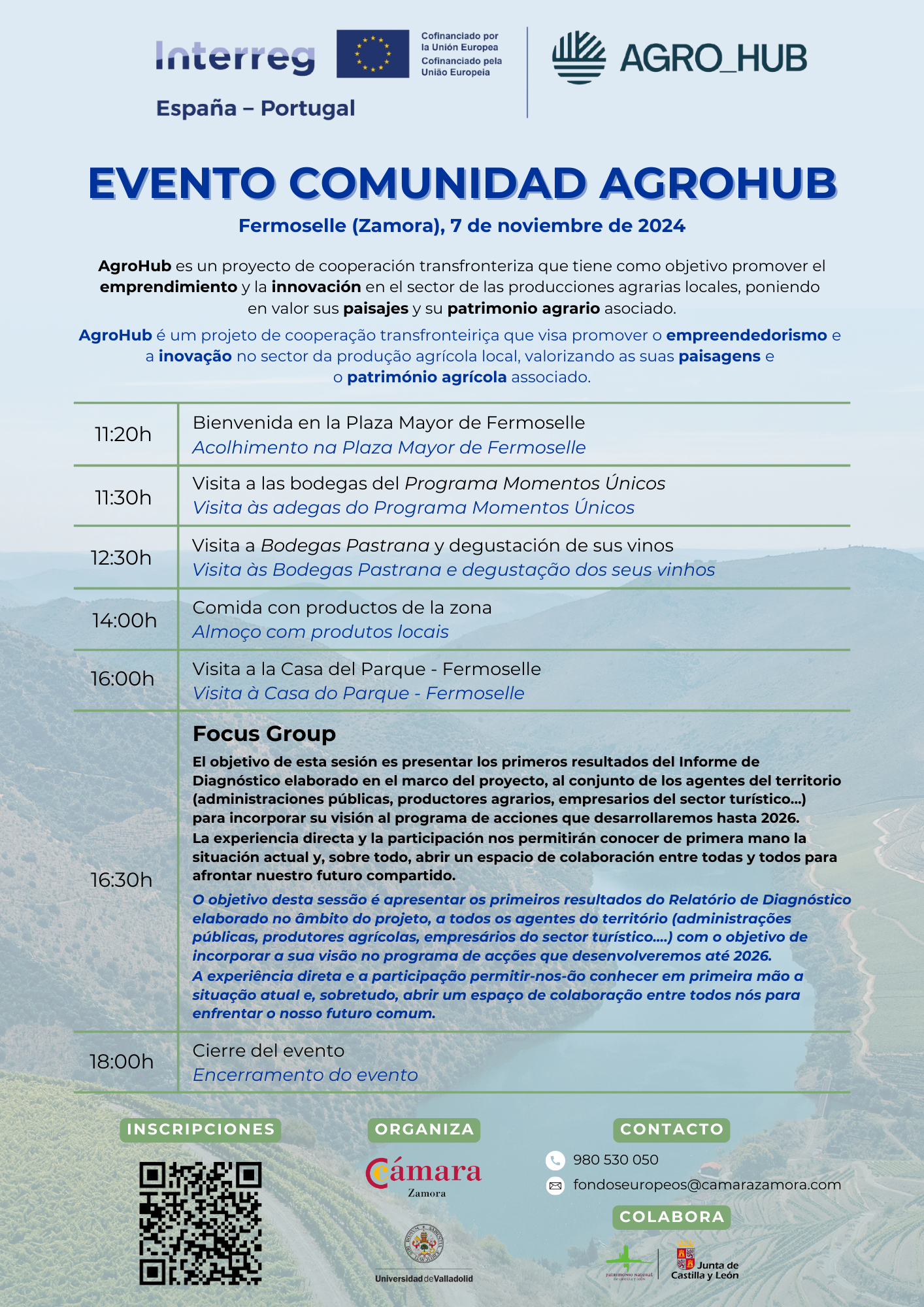 El 7 de noviembre de 2024 se celebrará el Focus Group Agrohub en Fermoselle - Zamora, la jornada consistirá en un Focus Group del proyecto AgroHUB en el que se presentarán los primeros resultados del Informe de Diagnóstico elaborado en el marco del proyecto. Los datos se darán a conocer al conjunto de agentes del territorio, formado por Administraciones Públicas, productores agrarios, empresarios del sector turístico, entre otros. Lo que se pretende es incorporar su experiencia, visión y necesidades al programa de acciones que se desarrollarán en el marco del proyecto.