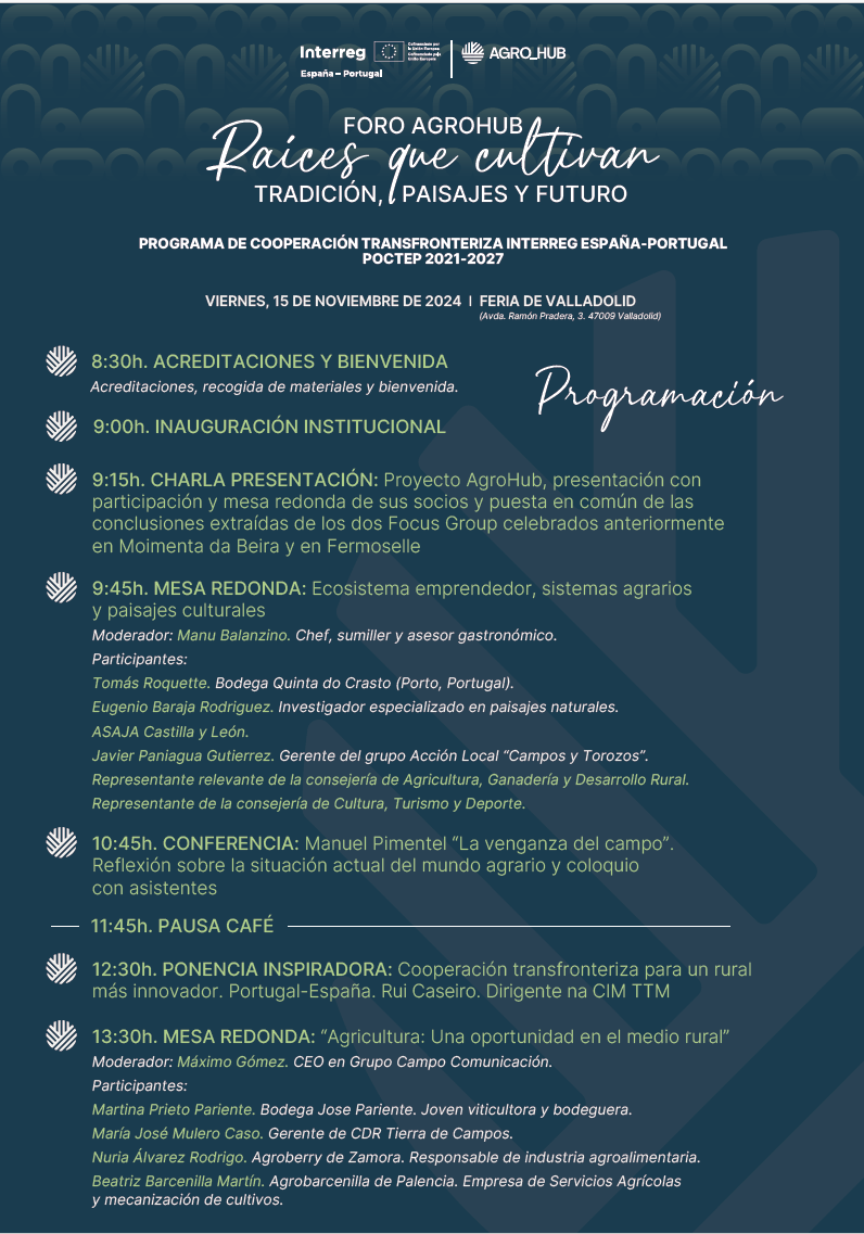 El Foro AgroHUB es un evento que busca fortalecer la cooperación entre productores locales en la región transfronteriza entre Castilla y León y el Norte de Portugal, promoviendo sistemas de producción alimentaria sostenibles. Este foro involucrará a actores clave, como productores agrarios, empresarios del sector turístico y administraciones públicas, y tiene como objetivo dinamizar la Comunidad AgroHUB, integrando la experiencia y necesidades de estos sectores para crear una estrategia de acción compartida que incremente la competitividad del sector agrario.