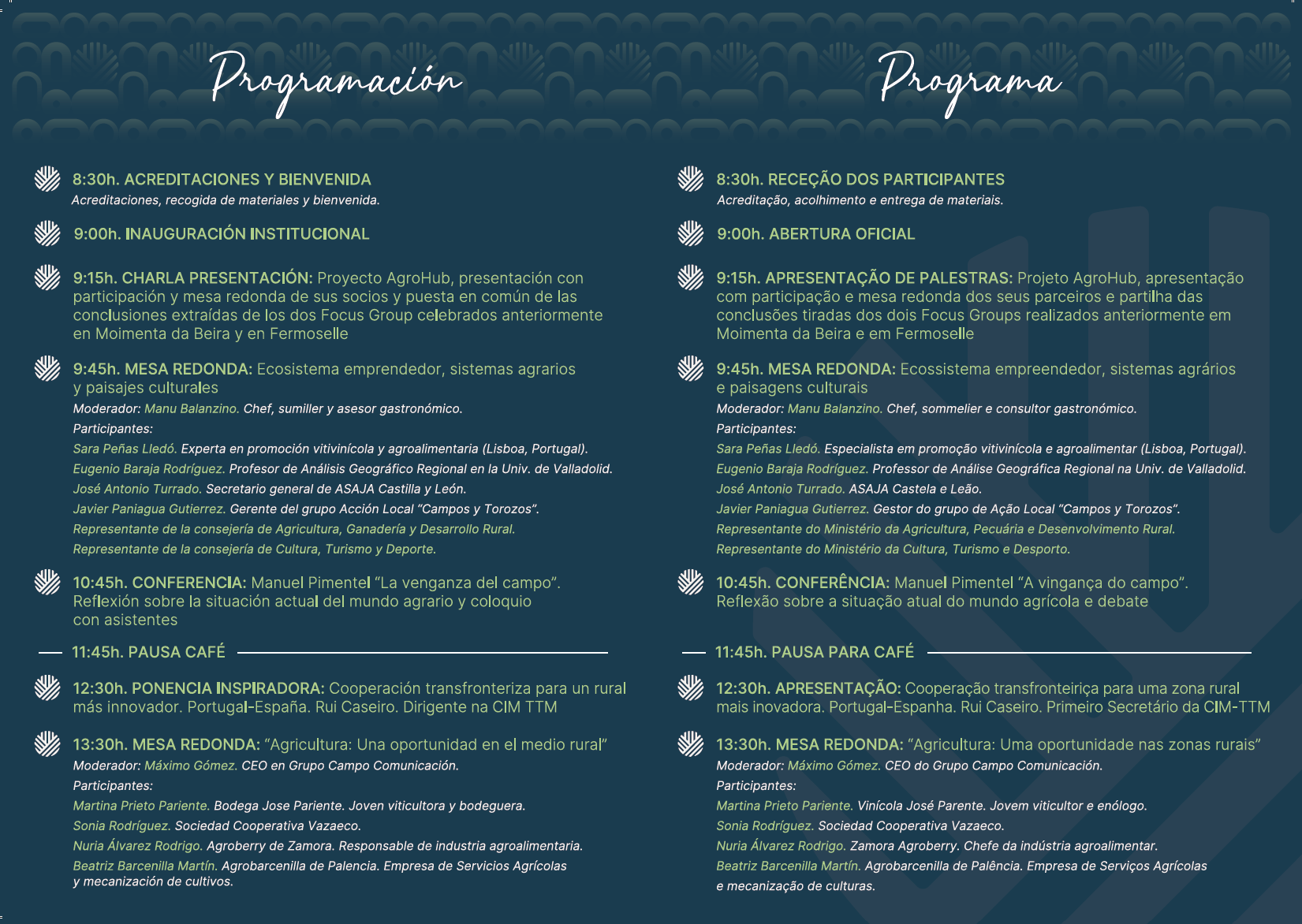 Fórum AgroHUB é um evento que visa reforçar a cooperação entre os produtores locais da região transfronteiriça entre Castilla y León e o Norte de Portugal, promovendo sistemas de produção alimentar sustentáveis. Este fórum contará com a participação de atores-chave, como produtores agrícolas, empresários turísticos e administração pública tendo como objetivo dinamizar a Comunidade AgroHUB, integrando a experiência e as necessidades destes sectores para criar uma estratégia de ação partilhada para aumentar a competitividade do sector agrícola.